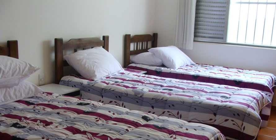 Os quartos são equipados com camas super confortáveis e diariamente higienizadas, alem de espaçosos guarda roupas.